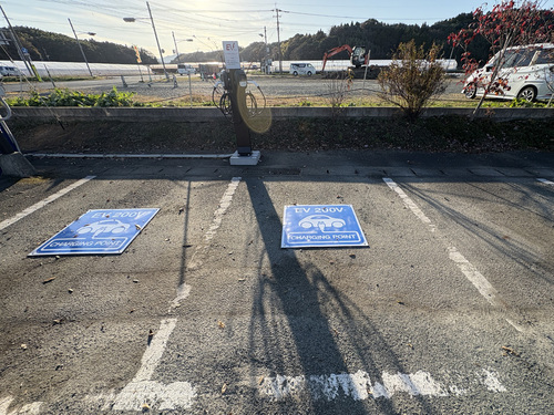 EV用普通充電設備は「TOYOTA」のサインポール脇に設置されています。 訪れた9/23は定休日だったのですが、充電用駐車スペースに駐車できる状態でeMP対応カードで認証も出来ました。