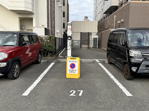 設置場所:ホテル東側駐車場入り口から敷地内に入りすぐ左折します。道なりに進み、2度左折した先建物沿い「27」の車室にEV充電器があります。
