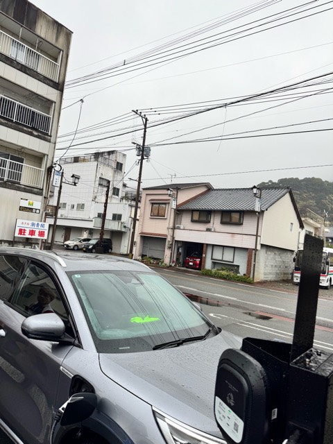 クリーニングショップの前にあります。 2時間以内の利用と書いてありました。 100Vと200Vがあり、専用区画となっています。