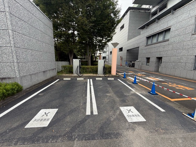 敷地に入って右側、建物の近くにあります。 建物も充電器もリニューアルされている感じです。