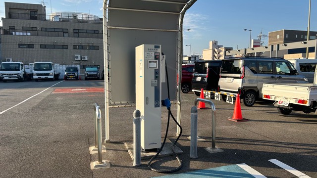 立体駐車場の3階入口で係員の方が満車なので上の階に行くように促しますが、充電器利用を伝えると3階に入れてくれました。充電器エリアはコーンが置いてありマナー良しです。普通充電ケーブルが短く車両後部左側の車は隣の駐車場のケーブル利用になりそうです。WAON使えます。