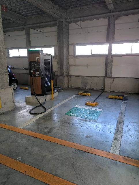 充電エリアです。 駐車場に入って直進。2Fに上がる前の左側にあります。