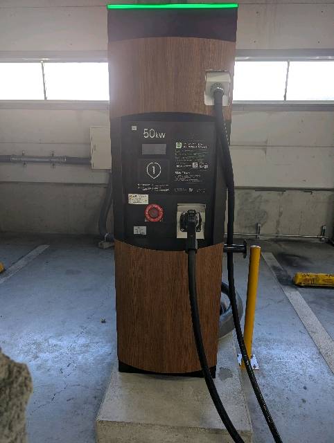 プラゴ運用の急速充電器です。1F駐車場の北東側スロープの手前にあります。