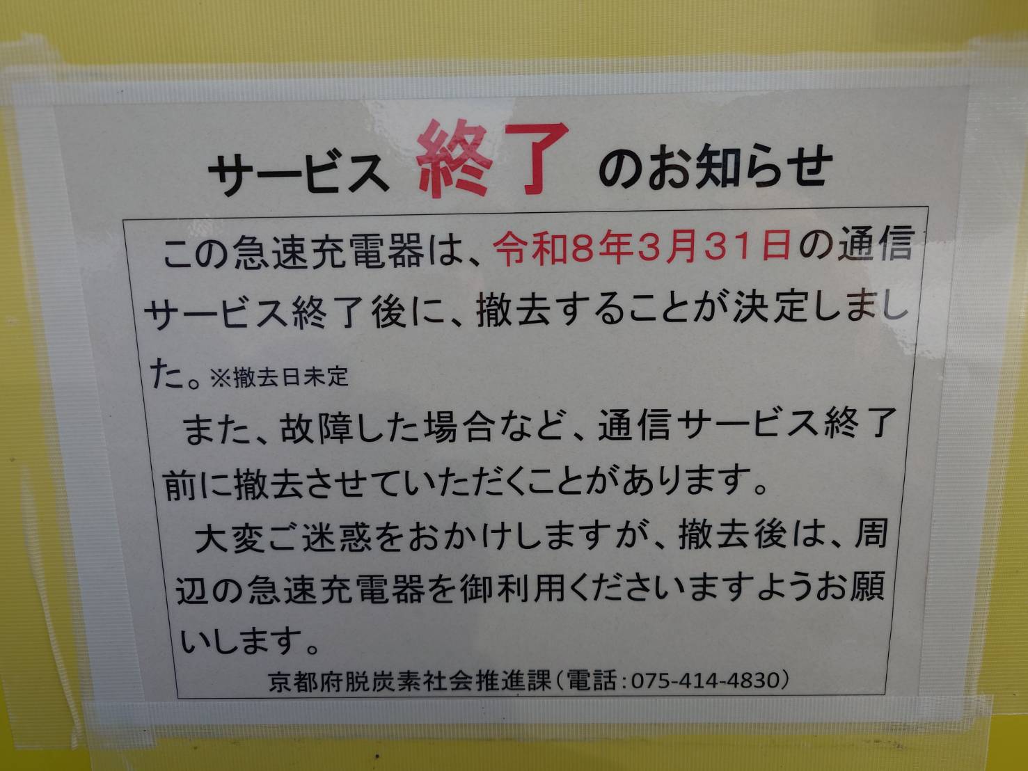 EV用CHAdeMO充電設備は、庁舎建物すぐ北側の駐車スペース東よりに設置されています。 西側にある来庁者用駐車場とは反対なのでご注意ください。 設置されているのは、最大125A放電するJFEテクノス製蓄電池なしモデルです。 私のアイ・ミーブXで設備最大の125Aで充電が始まったことを確認出来ました。 元々の仕様なのかは不明ですが、充電を始めると冷却ファン?が結構な音量で回っていました。 ファミリーマート福知山広峯町店から割と近い位置に有るので、ファミリーマート福知山広峯町店の補完設備としても有益だと思います。