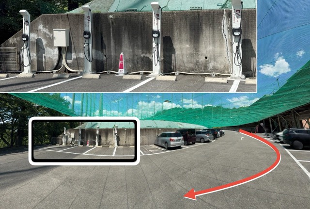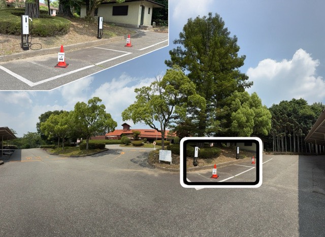 クラブハウスの近くにある車室(駐車場の北東)にあります。 以前と同じ位置でテラチャージの充電器に更新されています。文書と写真追加 コーンがあり安心感がありますね。ここはクラブハウスに近いので、一旦止めたら長期滞在するゴルフ場ではコーンで守られているのは大事だと思います。