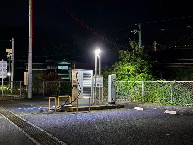 道路から見て左側、看板の足元にあります。 私の記憶する中で一番ヴィンテージ感のある充電器でした。