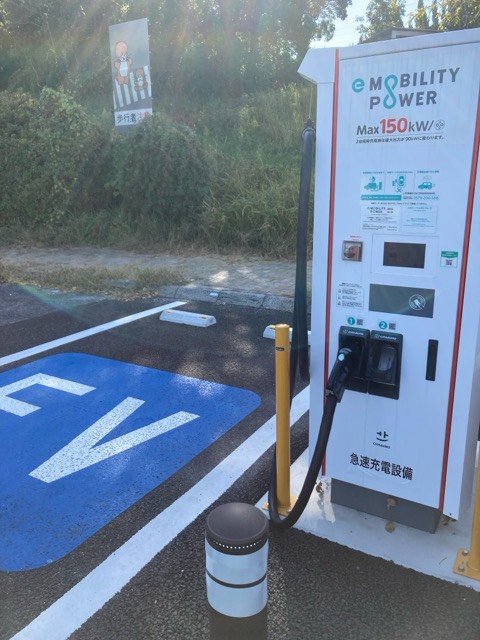 施設建物の手前にあります。文書と写真追加統合 写真の左側の150kWの2口と右側の90kWの2口の計4口の充電器があります。 充電後も移動してゆったり休憩できるのは良いかと思います。