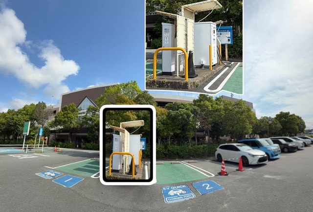 設置場所:南側出入り口側 平面駐車場8の前 [急速充電器] 夏季・冬季は機器保護のため30kW程度に出力制限される可能性があります。 充電30分まで。 [普通充電器] 充電60分まで。