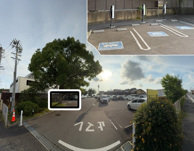 建物の南側、西の道から入ってすぐ右側にあります。 この時は普通充電をしようとしましたが、エラーでできませんでした。お店の方には伝えたので、今は解消されていると思います。