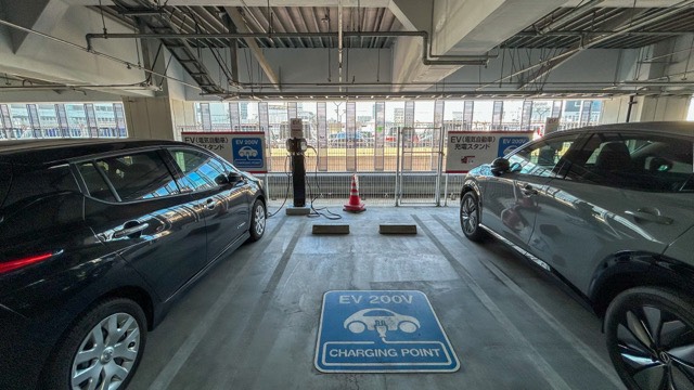 6階に2口×2器あります。カラーコーンもあり、非充電車は停めないように注意書きもありました。ありがたいです。