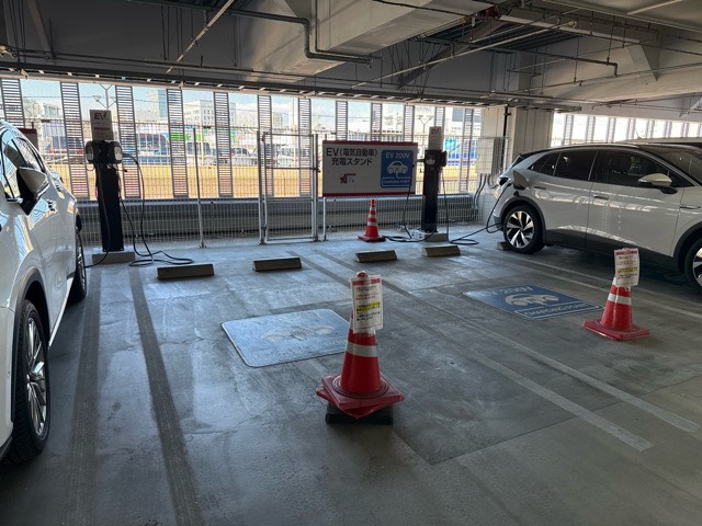 6階に2口×2器あります。カラーコーンもあり、非充電車は停めないように注意書きもありました。ありがたいです。