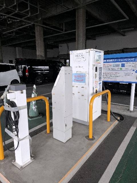 2基中1基(4口中2口)使えません。 駐車券発行機のすぐ右手にあります。 駐車枠が狭く柱が近接しているので、前向きでの駐車の方がいいかもしれません。 充電は無料(2025/6/29現在)でコードの長さも十分あります。