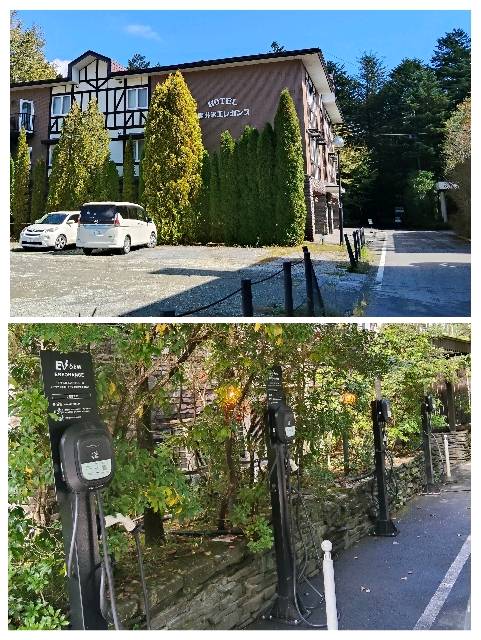 設置場所:村道2164号線よりホテル敷地内へ入り、左側の車室にEV充電器があります。 どなたでもご利用いただけます。 最大出力6kW
