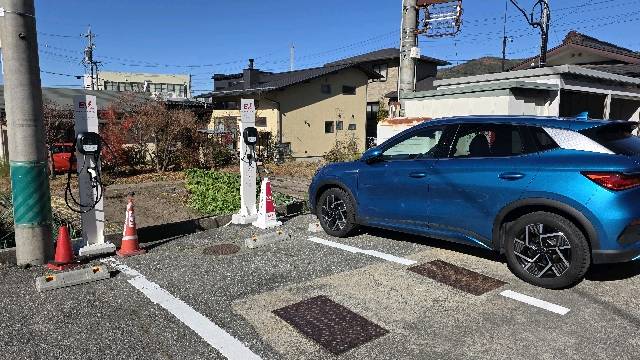 設置場所:施設の前にある駐車スペースに入り、変電設備のある隣の車室にEV充電器があります。 どなたでもご利用いただけます。 最大出力6kW