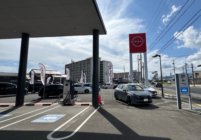 [急速充電器] 90kWの充電器が1基(2台同時に充電可)あります。 ★データチームより★ 最大出力90kWは、お車が対応しており、かつ1台で充電した場合の参考値です。 こちらの急速充電器は蓄電式となります。充電器側の蓄電残量が少ない場合には、お車側の残量が少ない場合でも最大出力は出ませんのでご注意ください。 [普通充電器] コンセントは店舗の営業時間内のみお使いいただけます。 日産車限定。 スタッフに要申し出。 試乗車・修理車の充電が優先となります。