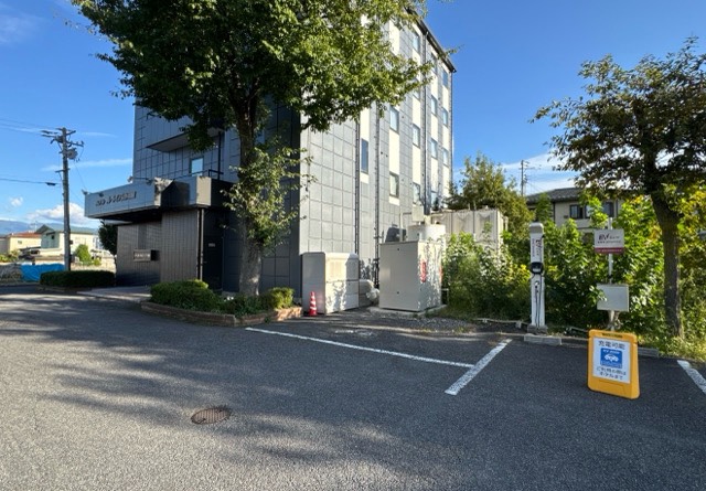 ご利用は宿泊者優先とさせていただきます。宿泊のお客様はホテルの公式サイトで詳細をご確認ください。 設置場所:長野バイパス沿い出入口より敷地内入ってすぐ左角にある車室にEV充電器があります。 充電器には鍵がかけられていますので、ご利用を希望される際にはフロントまでお申し付けください。 最大出力6kW