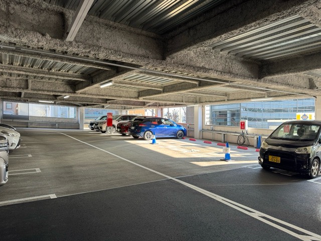 建て替え工事後に利用しました。 入り口入ってすぐ右に、EV専用のコーンが置かれた駐車マスが4台分あります。 うち2台はテスラディスティネーションチャージングで、残り2台は200Vコンセント(ケーブルなし)です。