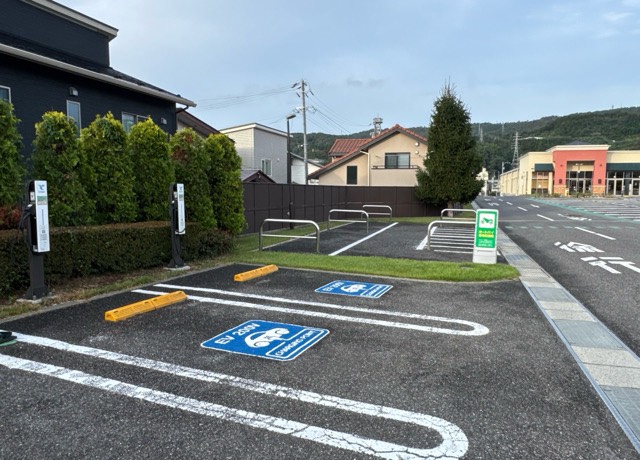 河村電器産業(株)製treev認証の6kW器×2器です。アプリ登録し、QRコード読取し充電します。店舗敷地東側出入口から入りすぐ左手駐車枠に設置されてます。駐車代は無料です。