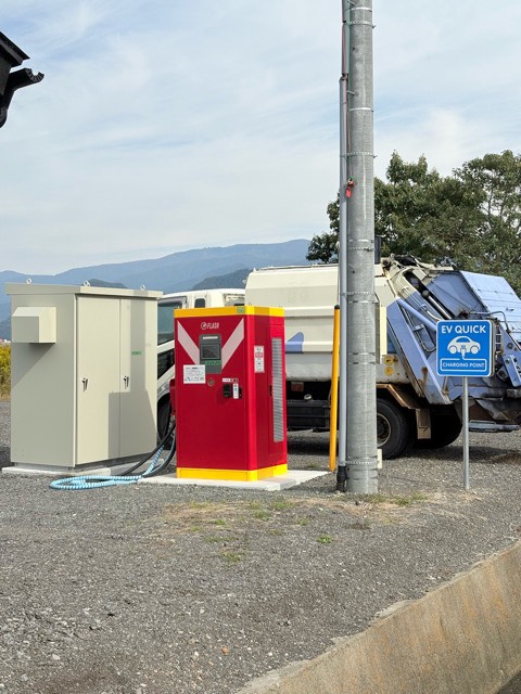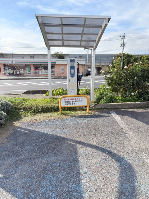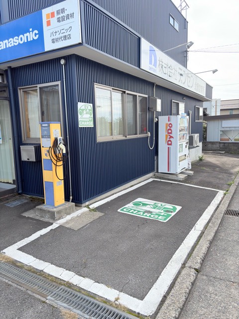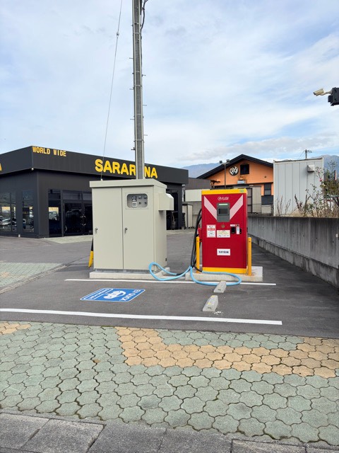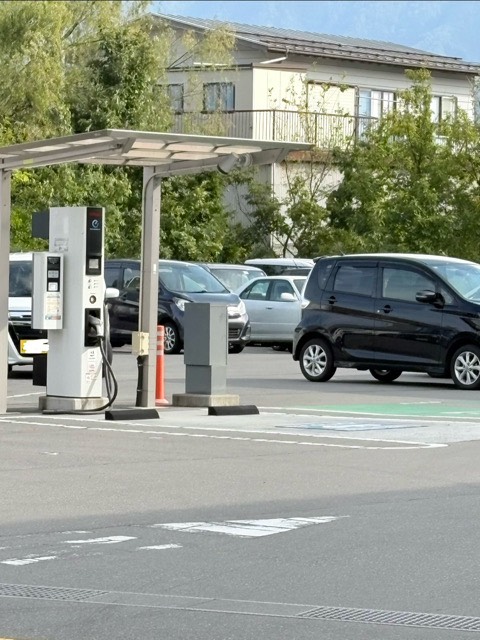 中古自動車買取販売会社の土地に設置されたFlashのquick charger。 西側じゃなくて北側から入るのがわからなくて通り過ぎて戻りました。 従量制のchargerは、ありがたいです。