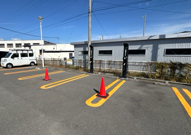 ABB製150kW2口器です。店舗の西側に設置されてます。広い駐車場なので転回スペースはあります。
