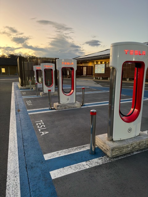 テスラチャージャー3機+コンセント2口あり。 駐車場は隣の施設を利用して無料にする手はありますが、対象施設はあまり充実していません。