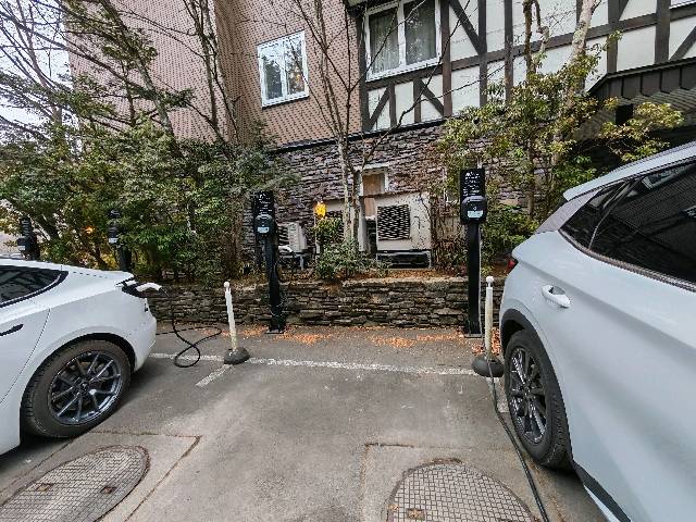 テスラチャージャー3機+コンセント2口あり。 駐車場は隣の施設を利用して無料にする手はありますが、対象施設はあまり充実していません。
