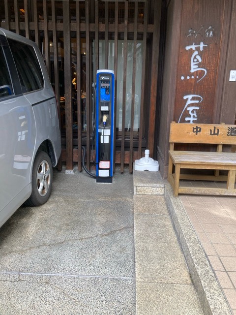 宿の玄関 すぐ 脇に普通充電器があります。 24時間利用可能ということですが 宿泊客が優先とのことです。