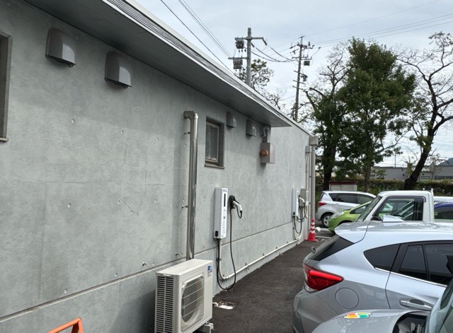 TerraCharge認証日東工業(株)製6kW充電器×2器です。敷地入り右手の建物に設置されてます。駐車台数が少ないので、充電しない車両の駐車もあります。
