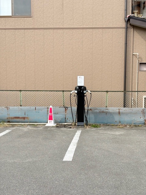 ココの駐車場は全くコーンも無く配慮が無いので利用するに覚悟してください。 普通にガソリン車が駐車してあるので昼間がいいと思います。 注意が必要な充電器。