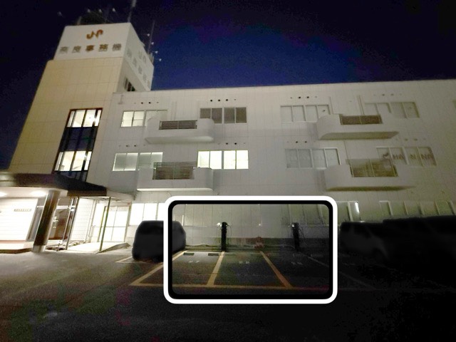 奥側の駐車場27車室にあります。 こちらの会社の自動車が駐車していて、せっかく充電器4台ありますが、1台しか充電出来ない状態でした。