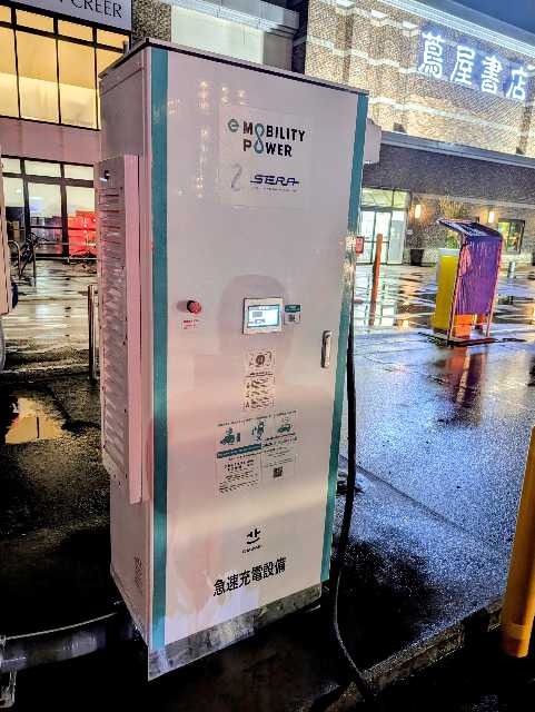 [急速充電器] 90kWの充電器が1基(2台同時に充電可)あります。 ★データチームより★ 最大出力90kWは、お車が対応しており、かつ1台で充電した場合の参考値です。 [普通充電器] コンセントは店舗の営業時間内のみお使いいただけます。 日産車限定。