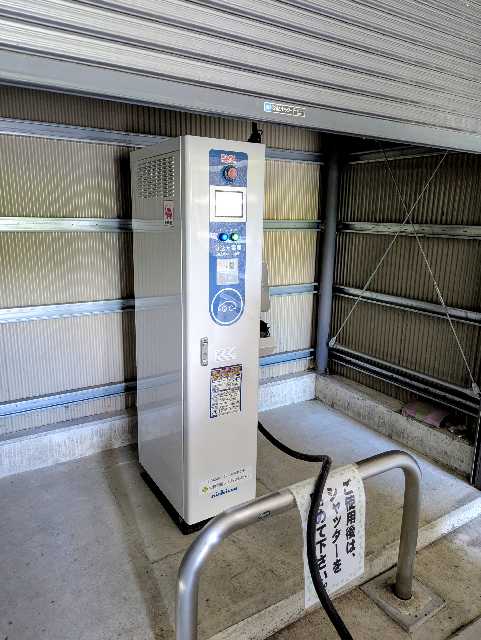 大きな車庫の中に、更にシャッターを開けると、充電器が現れました。出力は小さいけど、貴重な場所にあって、有り難いです。
