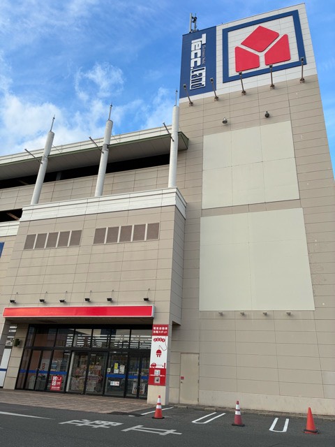 建物に向いて右側の赤い店舗出入り口の右側にあります。 ヤマダ電機になっておりました。
