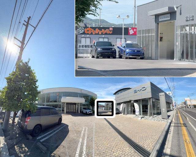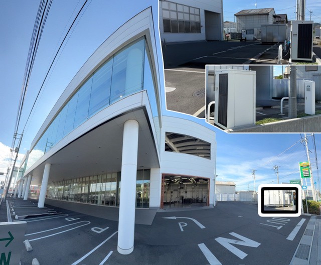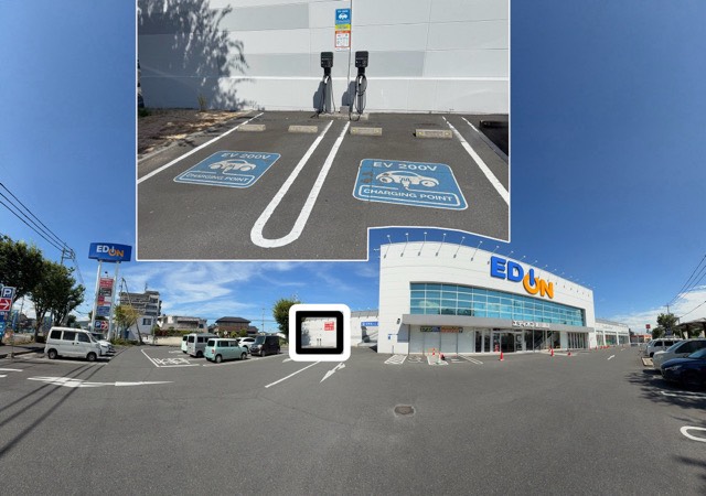「軽自動車.COM 東岡山店」ですが、「ダイハツマーク」と「双葉車両」のサインポールを目印にすると見つけやすいと思います。 EV用普通充電設備は、ショールーム前の駐車スペースに設置されています。 充電設備は4台設置されていますが、私が訪れた時は社用車と掲示のサクラ2台が充電中。 eKクロスEVとアリアが充電せずに駐車していたので、フロントに「充電したいのでどちらか移動して欲しい」声を掛けるとeKクロスEVが移動して充電開始。 敷地から外出するのでスタッフに声を掛けて名字と携帯番号を伝えて外出。 充電の合間に昼食と買い物などを済ませました。