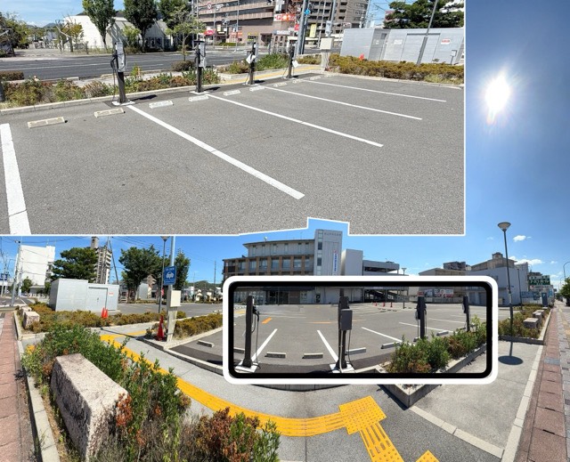 大通りから入ると、建物の左の奥がわの駐車場にあります。建物の西側の駐車場ということになるでしょうか。 充電器は更新されている気がします。