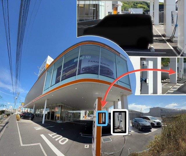 道路から見て右側(東)の急速充電の奥(左)にあります。写真統合