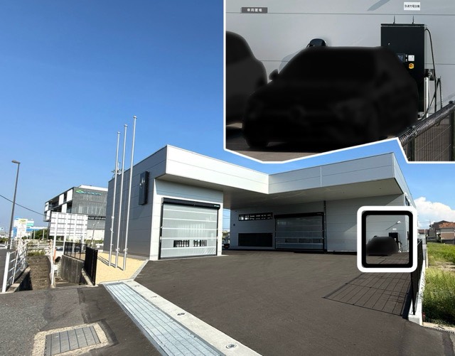 EV用CHAdeMO充電設備は、三菱の大きなサインポール脇に設置されています。 設置されているのは、最大125A放電するニチコン製です。