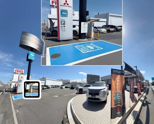 EV用CHAdeMO充電設備は、三菱の大きなサインポール脇に設置されています。 設置されているのは、最大125A放電するニチコン製です。