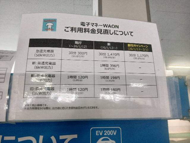 ここだけではないでしょうが、1月13日から値上りするそうです。300円はかなりありがたかったので悲しいすが、他のゲスト充電の料金からしたら妥当なのかもしれません。