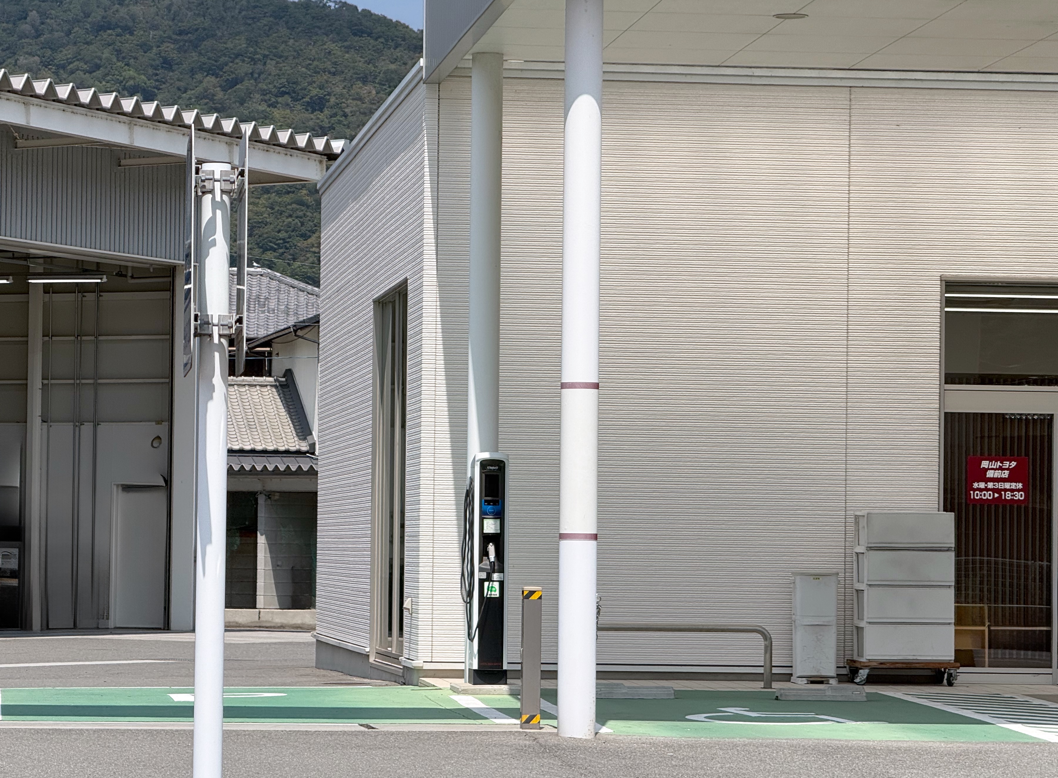 EV用普通充電設備は、国道2号線から敷地に入って少し直進し屋根をくぐった左側に設置されています。