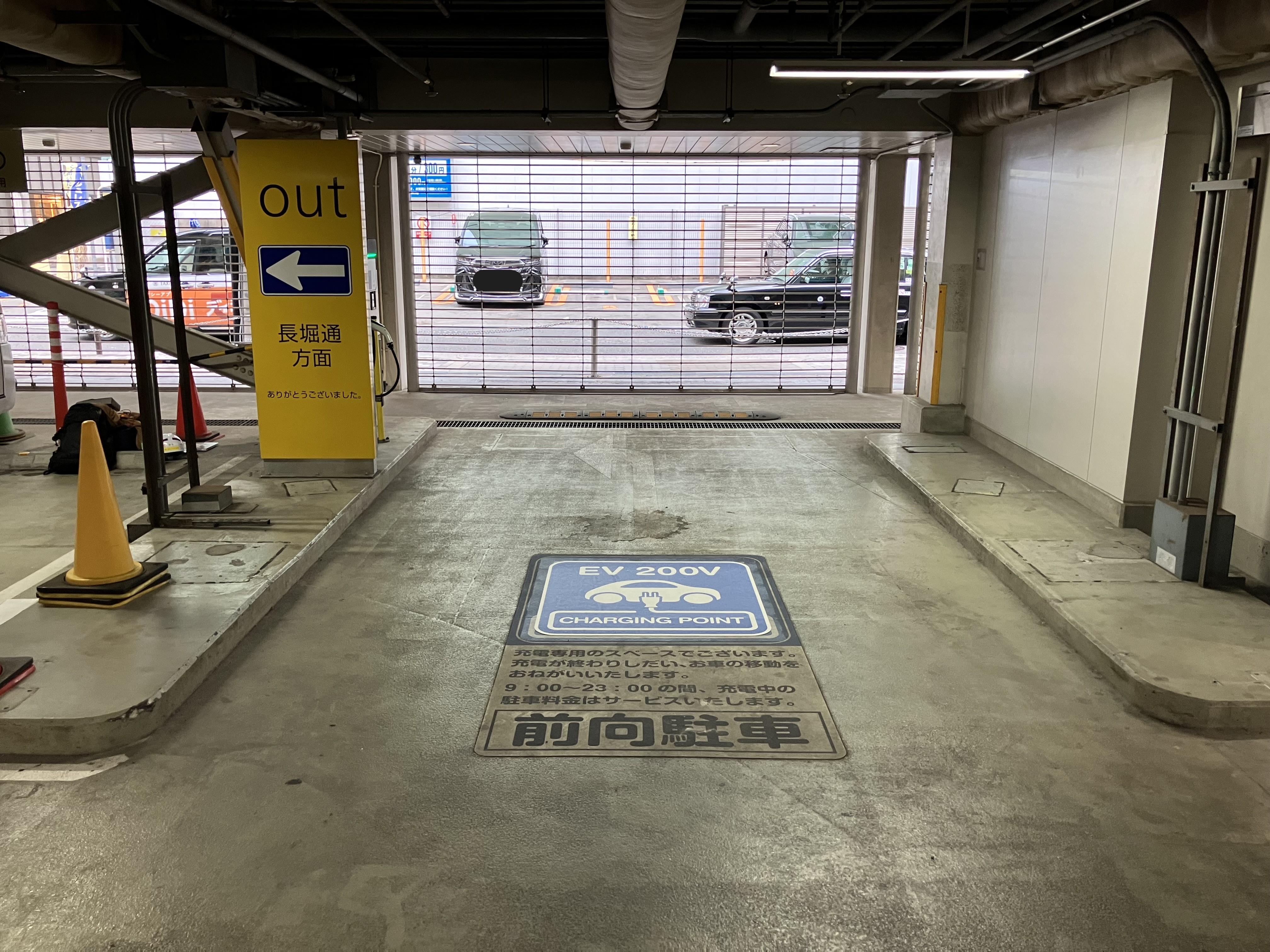 入り口です。 コインパーキングは急速充電よりエネチェンジのような普通充電が良いと思います。