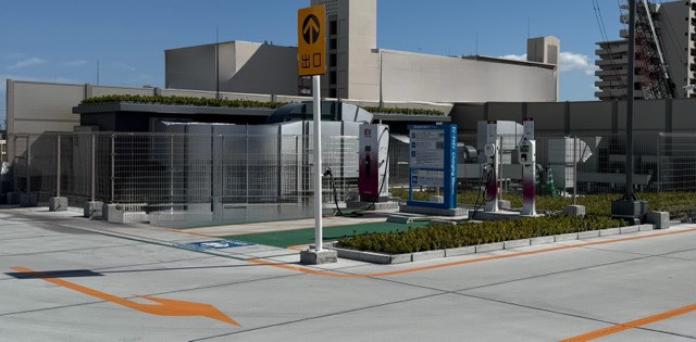 EV用充電設備は、スロープを上って屋上駐車場に入ってすぐ右側に設置されています。 と言うか駐車場は屋上だけなのですが・・・。 設置されているのは・・・ CHAdeMO充電設備:最大125A放電するニチコン製 普通充電設備:最大30A放電するZEROVA製 です。 ENEOSチャージプラス対応なので、多くの決済方法が選べます。 敷地内にそれなりのお店が営業しているので「ついでに充電」しやすいです。 長時間滞在する時は普通充電を積極的に利用しましょう! 2000円以上利用すれば入庫後2時間まで無料みたいです。 ただ「高さ制限2.3m」となっているので、ルーフボックスなどを取り付けている車は注意が必要です。