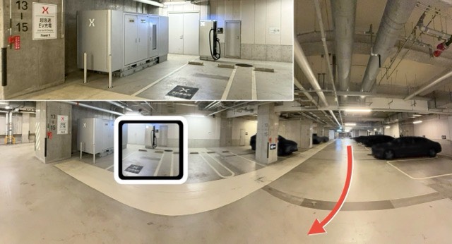 地下3階の出口の手前を右折し、最奥部の13〜15と書かれた車室にあります。 南館と違って案内の方がいませんでした、PowerXの標識もあるにはありますが小さめなので見落としに注意です。