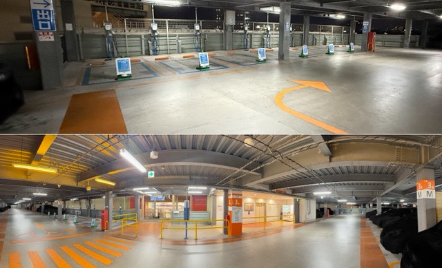 北側入り口から入って立体駐車場3階のエレベーター付近の左右に分かれて並んでいます。投稿を忘れていて1月以上前の写真になっています。 休日の夕食どきです。コーンはすべてに置かれていて全く非充電車いませんでしたが、充電もいませんでした。その他の車室はかなり混雑気味でした。 私もコーンを移動してまで充電する必要もなくて食事しましたが、結局誰も充電していませんでした。他にもEVがいたと記憶していますが、使えない充電器だというつもりは全くありませんが、ここは充電器の数も多いのでさっと気楽に充電できるエリアも一部ほしいですね。