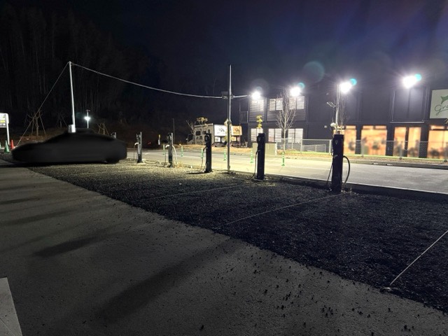 敷地に入ってすぐ右側に見えていますが、順路は大回りで行くような雰囲気でした。 到着時は2台が止まっていましたが充電はされていませんでした。私も充電カードが使えないため、充電しませんでした。 私的には目的地充電は「充電しなければならない」ような運用ではなく、気軽に繋げるなら継ぎ足し充電しておいたら便利なようにEVの運用をしているので、アプリ縛りがあったり手間がかかるような充電器は基本使いません。 バッテリーは50kwhよりすこし上の容量で往復260kmをバッテリー80%ぐらいから出発しましたが、他の充電スポットで目的地充電を適当に繋いでいるだけで20%以上で帰れました。深夜から充電して、翌日は70%超になり160kmを走りましたが、目的地充電して60%弱で帰りました、 途中で充電カードが使えない箇所があったために、2分だけ急速充電をしましたが・ EV普及には、困ったら手間をかけても充電できるインフラ、とかではなく、気楽に繋げてバッテリー残量は減りにくくて航続距離が伸びるような、よく行くところで充電できるインフラが必要だと思います。 アプリ縛りではなく、充電カードや電子マネーなどが使えて、なおかつ、その充電器のプロバイダーの自社アプリならより便利であれば、アプリを使って充電すると思います。今のところエネチェンジが一番近いと思いますが、、そのような仕組みの登場が欲しいです。テラチャージとDMMは提携するらしいですが、もっともっと繋がってほしいですね。