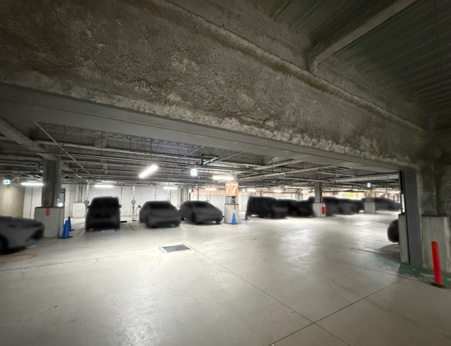 地下駐車場に普通充電器が9台あり、青いコーンがスペースにあるので、充電エリアであることがわかりやすく示されています。ただし、充電ケーブルがかなり短いタイプのもので、バックで入れた際の右側の後ろ側に設置されてます。車種によっては、充電スペースの(バックで入れた際の)後ろ左側の機械からケーブルを引かないと届かないかも?