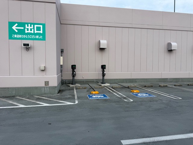 お店の正面から見て右側の近辺にあります。 今となっては少し緩めの充電出力ですので30分の制限がなくなれば、食事でも急がずに普通に楽しめれば有益な充電ライフになるような気がします。 普通充電が複数台あっても使い勝手が良いと思います。