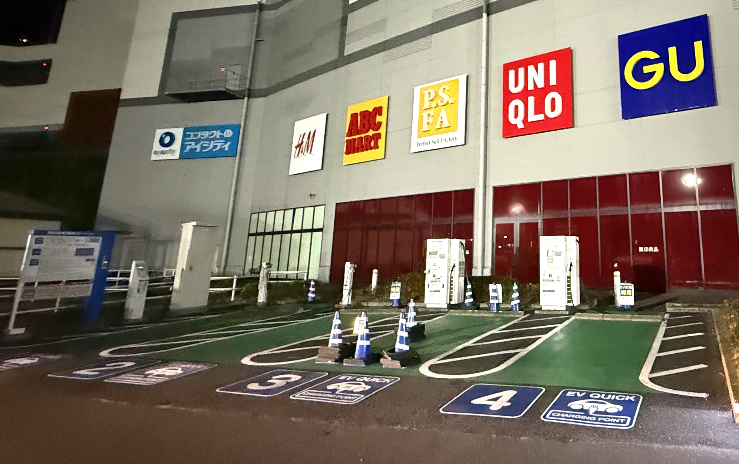 EV用充電設備は、北側平面駐車場 Eエリアに設置されています。 少し古い情報ですが、8/9(土)19時台に行ってみると、2台あるCHAdeMO充電設備のうち1台は故障中。 もう1台にはテスラモデルYが接続していましたが、液晶画面を見るとエラー表示になっていました。 エラー表示になっているのなら、充電用駐車スペースをサクッと譲るべきだと思いました。