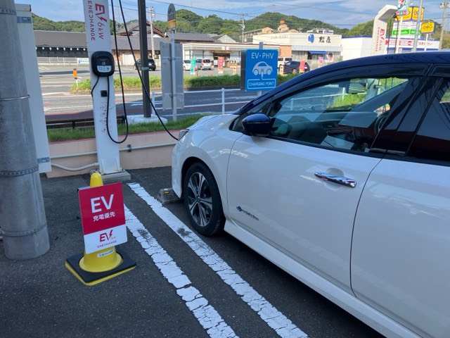 EV用普通充電設備は、R204沿いの店舗入口に近いところに設置されています。 私が訪れた時は、充電設備2台分に対して駐車スペース3台分にカラーコーンが置いてあったので、多くの車種で問題なく駐車&接続できると思います。