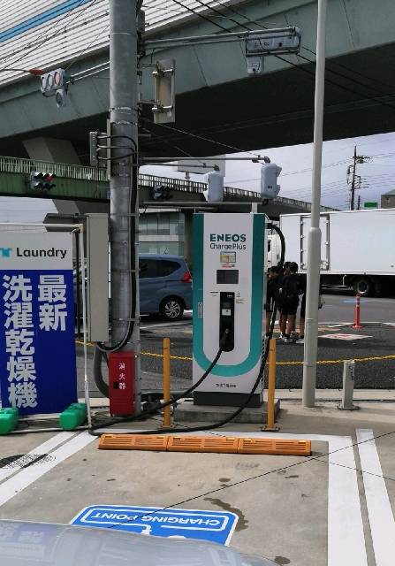 ガソリンスタンド交差点角に50kwhの急速充電器があります。 駐車スペースも広く便利ですが、コインランドリーが併設されていてそちらを利用する方が充電スペースに駐車している場合がありますのでご注意ください。